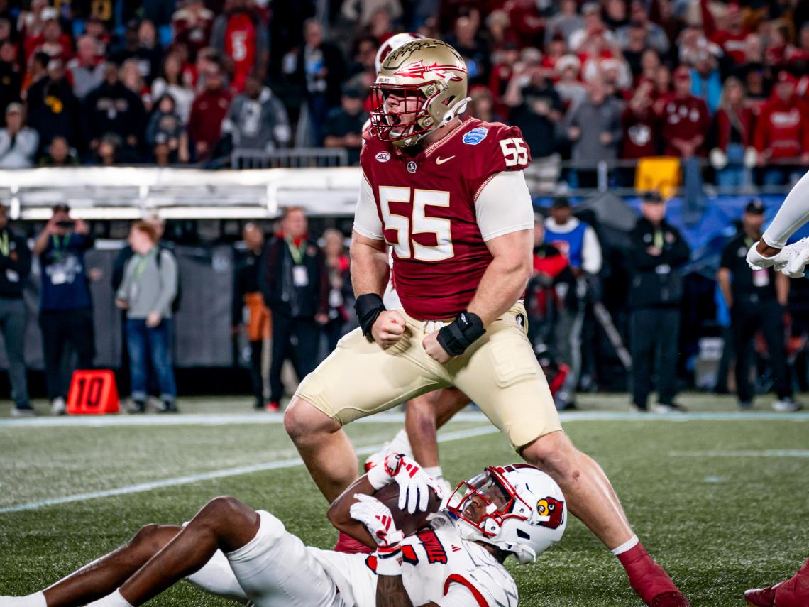 KEY MATCHUP: #4 Florida State (Jared Verse, #1 Edge). Overpowered Verse on bull rushes, sent him reeling on run blocks, but struggled to keep pace with the finesse moves. Allowed 0 sacks, but a few close calls.